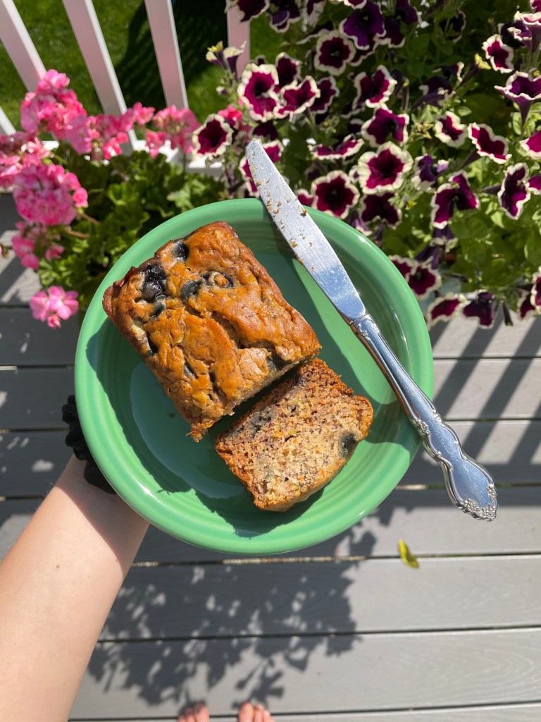 I stuck to the same general recipe of my first banana bread but also threw in about a cup of blueberries and a cup of shredded and drained carrot+zucchini. I love this banana bread because it’s sweetened by the bananas and honey and when you mix in the carrot+zucchini you can’t even taste them. They add a little color to the bread and a bit of your daily veggies. It’s so yummy 🙂