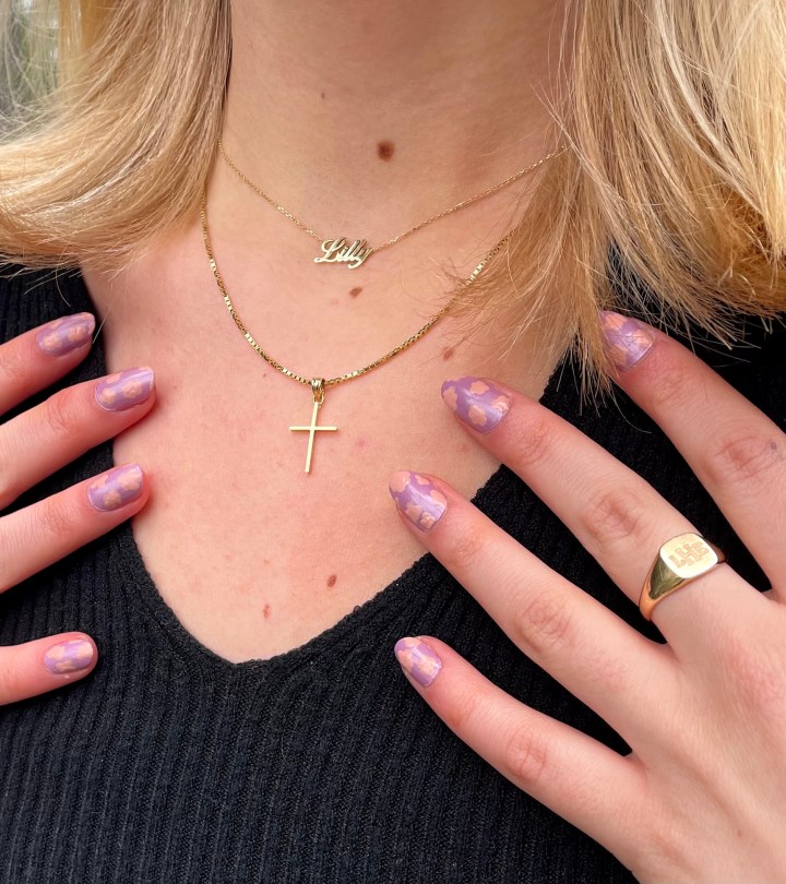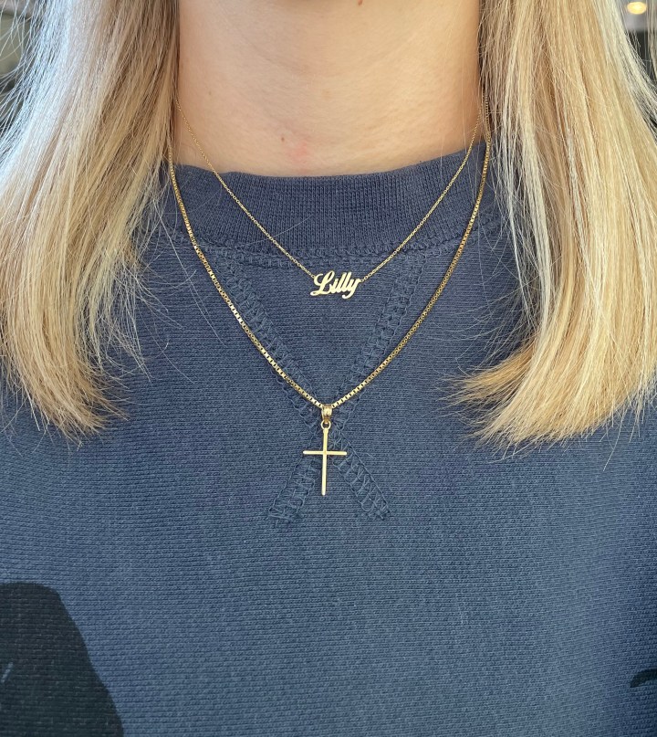 My grandma passed me this cross necklace and I’ve been wearing it every day since. You could search up simple gold cross necklaces and easily find a similar one