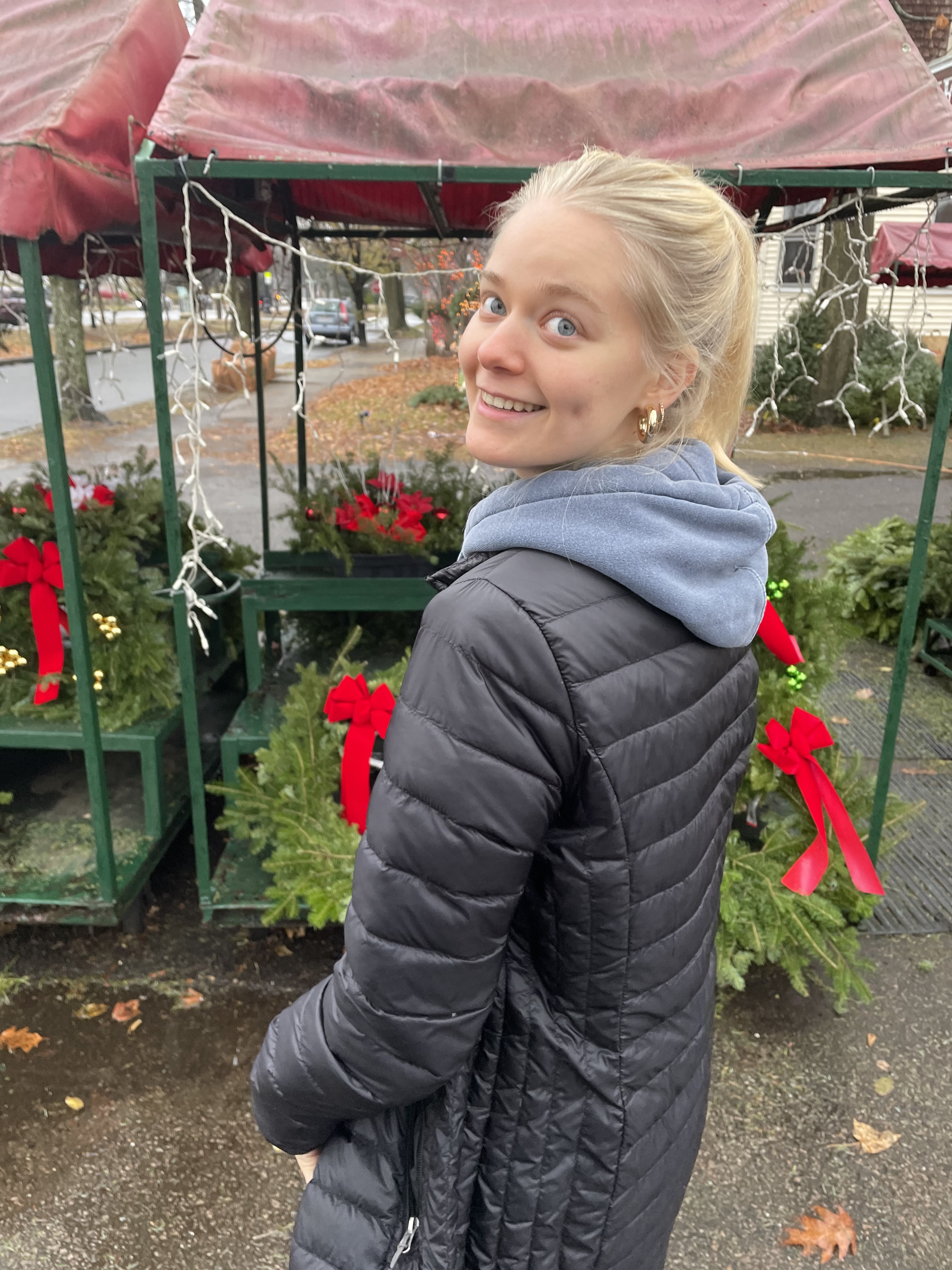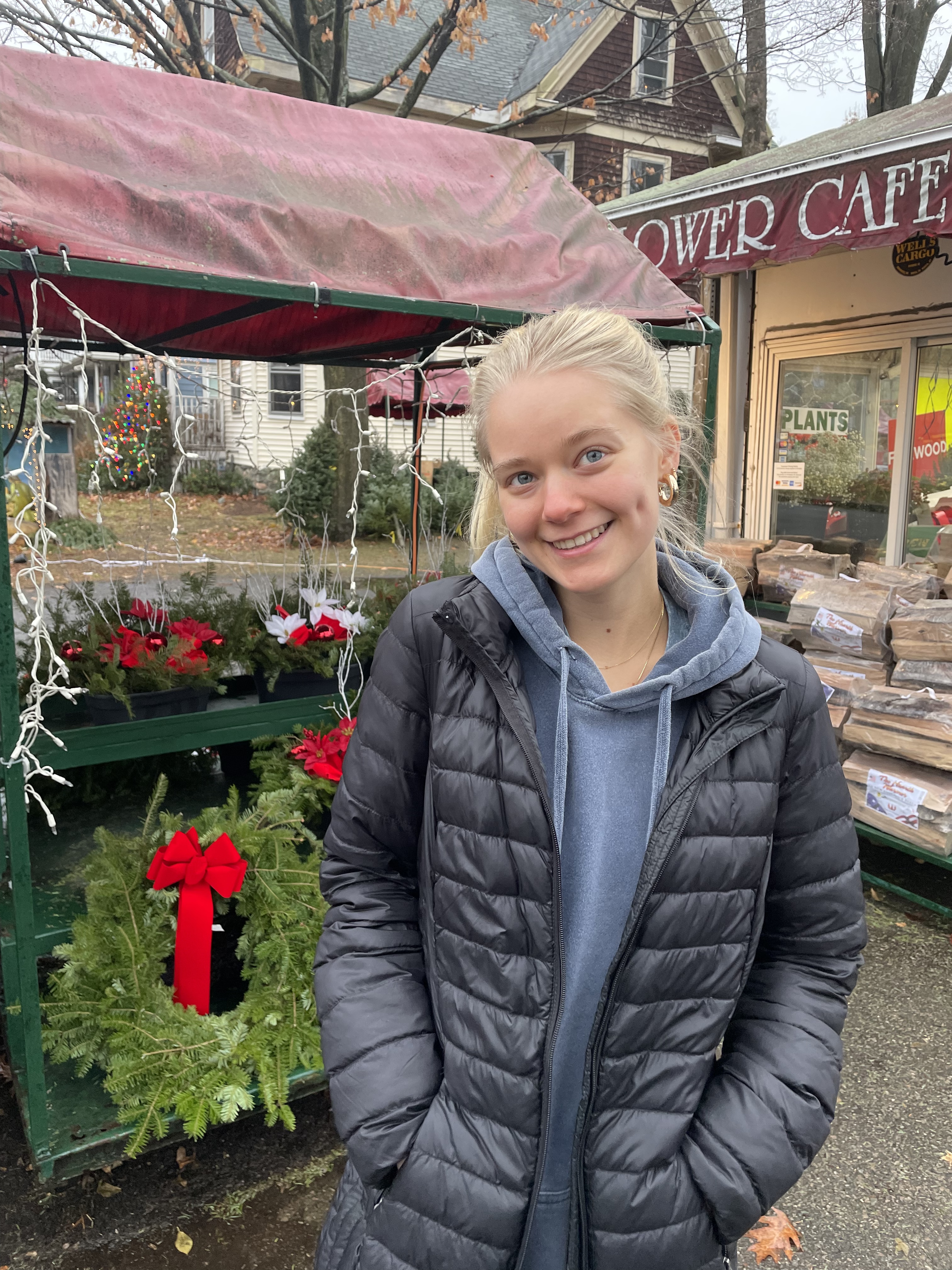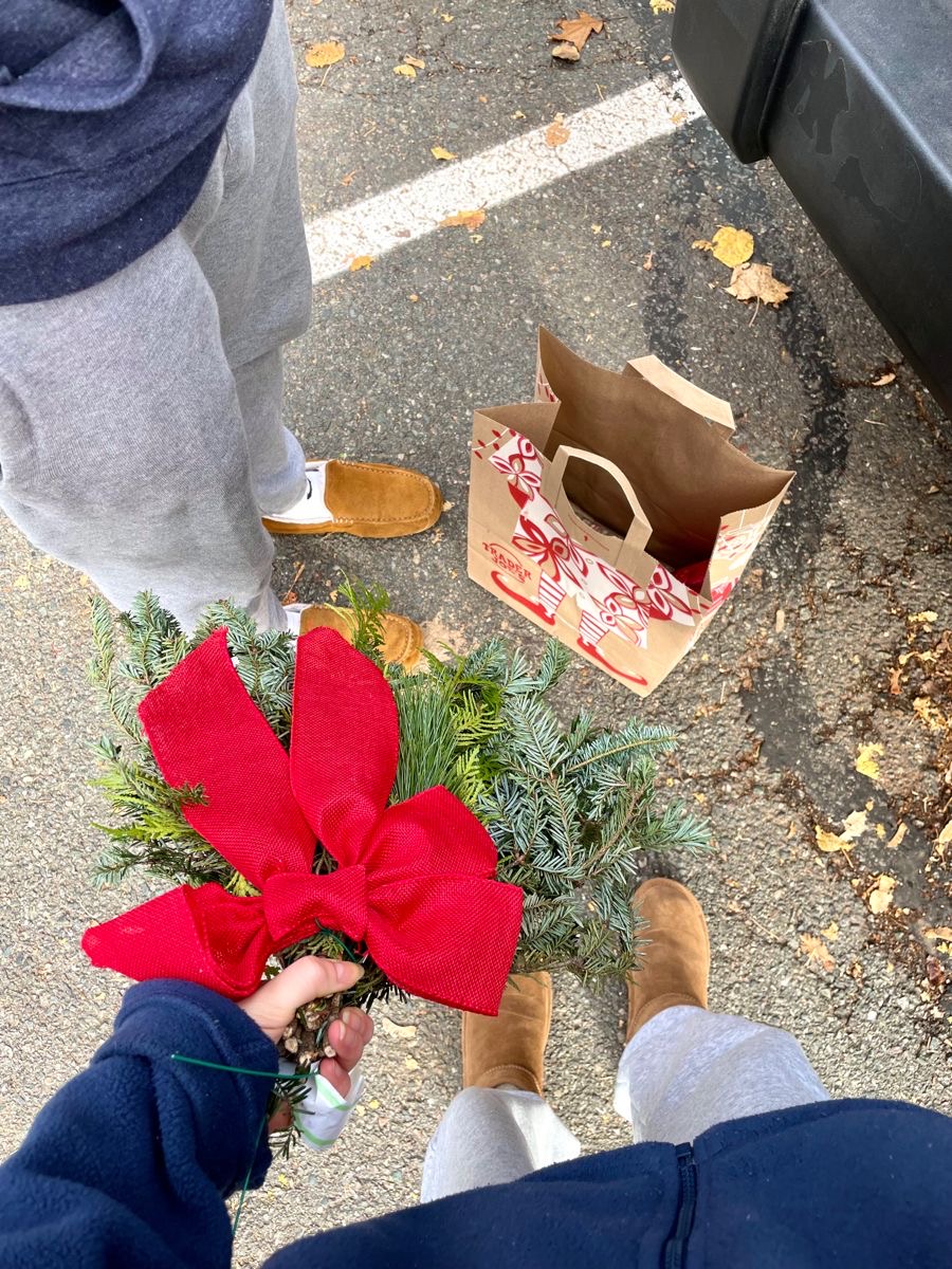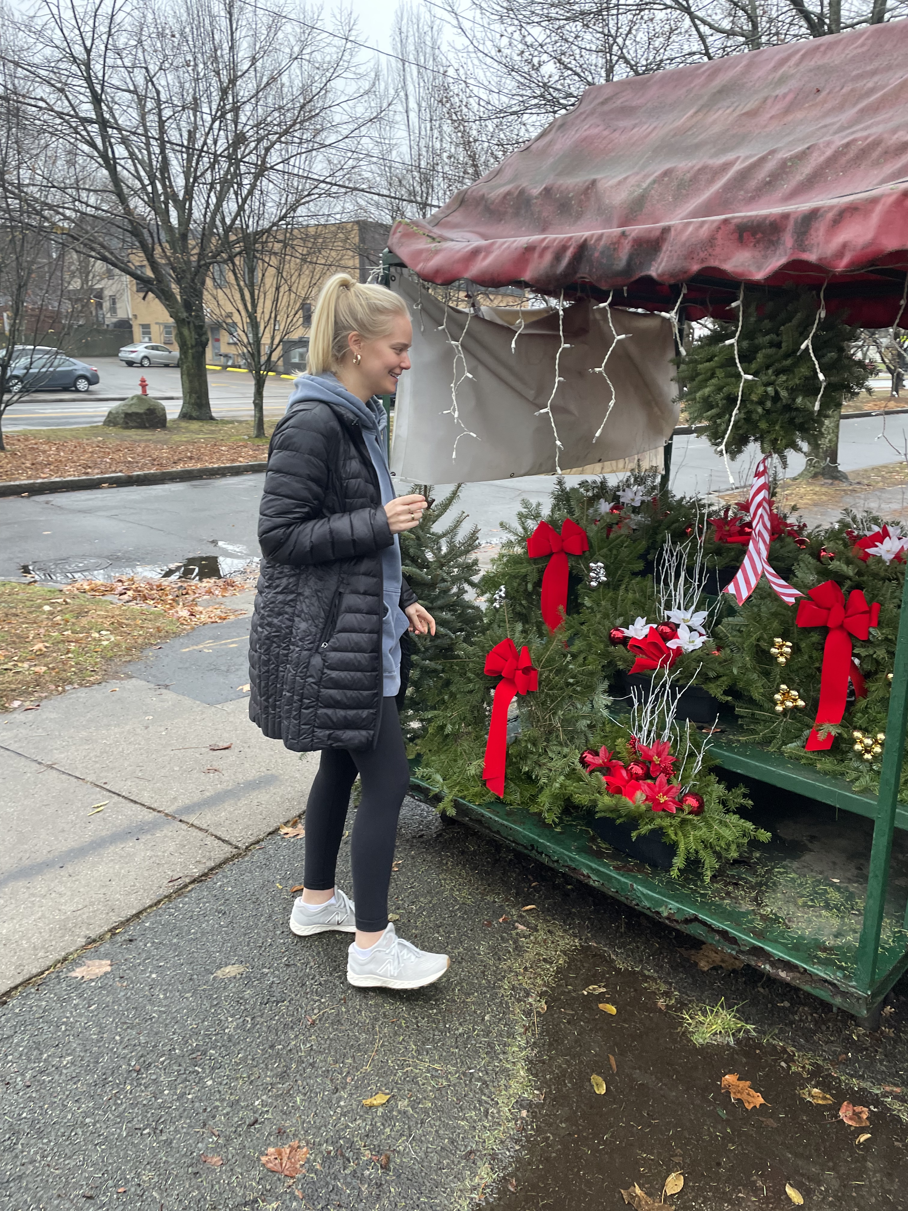 I was walking around Boston after my internship a few weeks ago and passed a man making wreaths on a table right outside his apartment’s front door. He had different greenery, red berries, and pinecones that he was arranging in his wreaths. I looked as i walked by and complimented his work because of how beautiful they were and how unexpected the set-up was on my walk around the city.