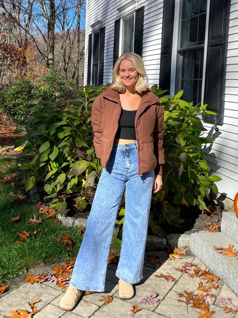 I love this outfit. The basic white tank is a perfect everyday basic, super stretchy, and great quality fabric. This brown puffer is PERFECT — so warm and amazing quality. Then this denim skirt is the first denim skirt I’ve had in yearsss and it fits beautifully! Sits perfectly on my waist and is a comfortable fit down my hips.