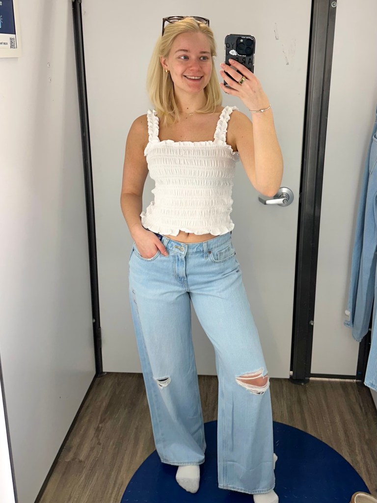 I loveddd this scrunchy tank & wide leg jeans. I wear a lot of basics in the warmer months so i thought the texture of this shirt was such a fun touch to level it up. I’ve also been loving the wide leg pant look and these were such a perfect light wash with the distressed knees.